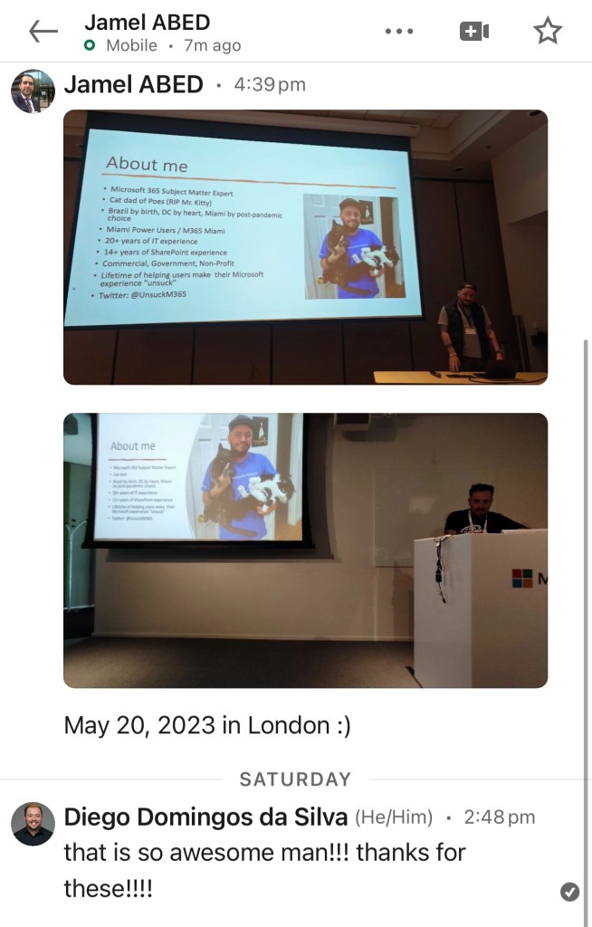 Fast forward a couple months, I kept pushing my message and I was fortunate enough to be able to do it again in Boston for #CollabdaysNewEngland, Ottawa at #M365Ottawa, Mexico City at #CDMexicoCity, Washington, DC at #M365DC, and finally yesterday. So many new features have been introduced ever since (most still in preview mode), and while my session is not dated, I knew Utah was going to be the last time I was presenting this iteration of it.