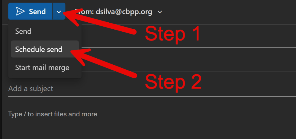 In Outlook: After composing your message, click the drop down next to “Send”, choose “Schedule send”, then pick your desired date and time.