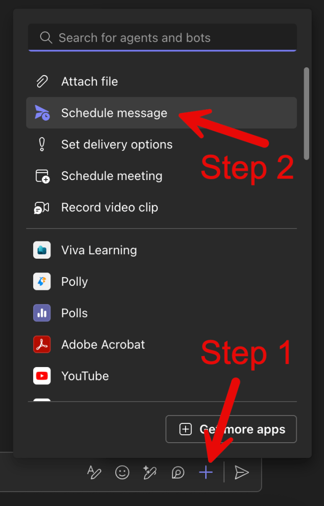 In Microsoft Teams: While slightly trickier, the option is also there. After writing your chat message, click the small arrow next to the send icon, select “Schedule send”, then choose your preferred time. Just make sure you are already in a conversation with the person first, otherwise the option will not be there.